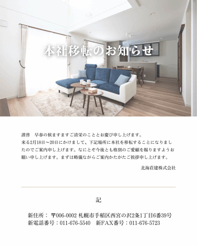 来る2月18日~20日にかけまして、下記場所に本社を移転することになりましたのでご案内申し上げます。なにとぞ今後とも格別のご愛顧を賜りますようお願い申し上げます。まずは略儀ながらご案内かたがたご挨拶申し上げます。