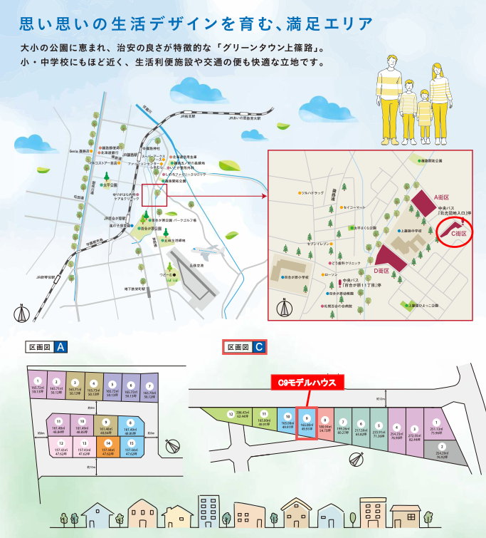 JR学園都市線「百合が原」駅徒歩18分、「篠路」駅徒歩19分、地下鉄「栄町」駅バス乗車8分「上篠路」大きく広がる!価値ある未来エリア!区画C-9モデルハウス!